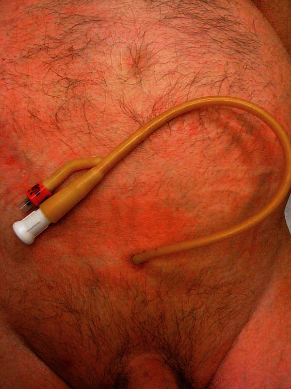 A catheter 12 to 13 in (30.5 to 33 cm) long, used to pass into a man's bladder.