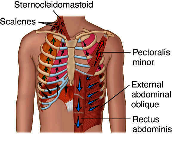 Respiration performed entirely by expansion of the chest when the abdomen does not move. It is seen when the peritoneum or diaphragm is inflamed, when the abdominal cavity is restricted by tight bandages or clothes, or during abdominal surgery.