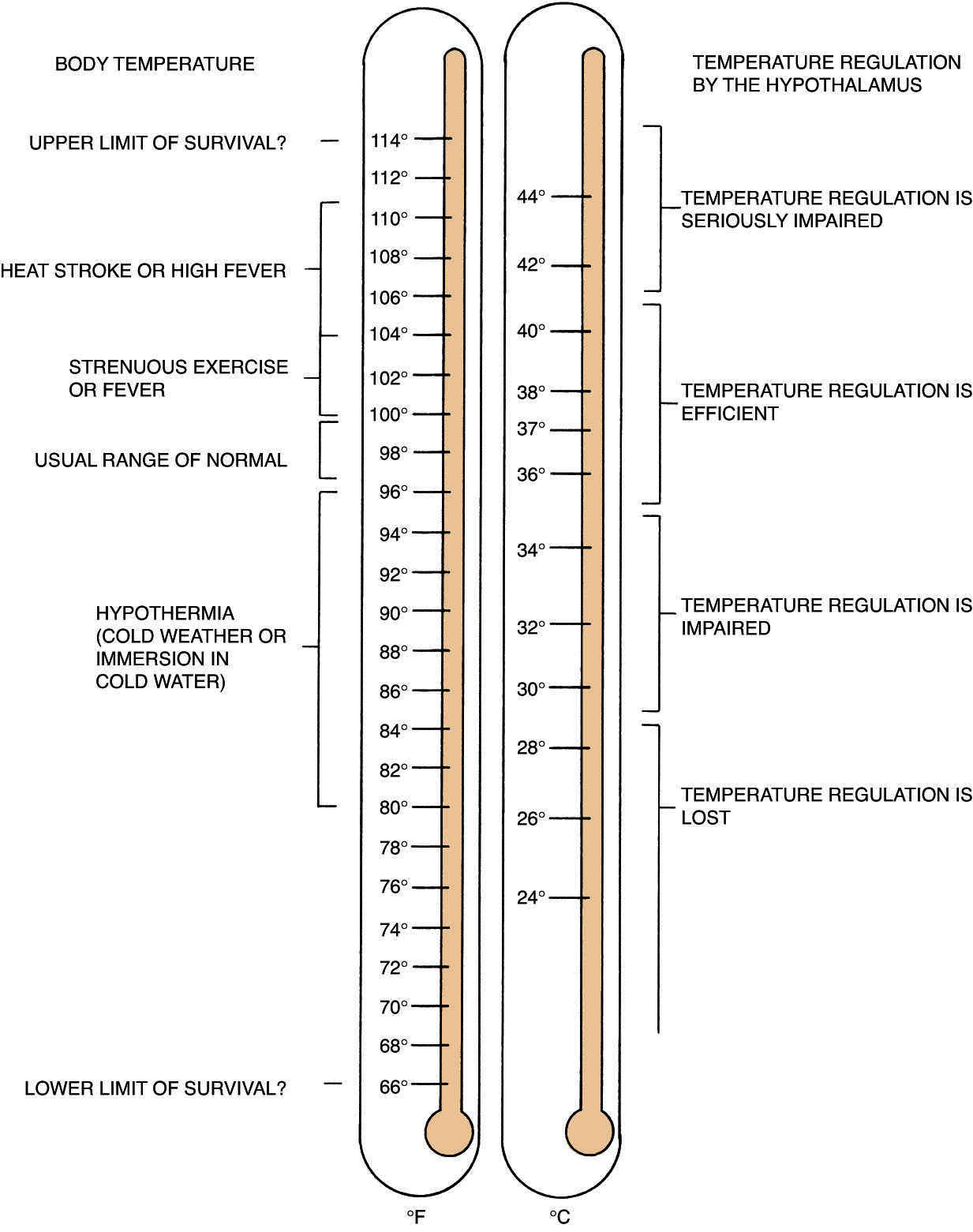 Body temperature is regulated by thermoregulatory centers in the hypothalamus that balance heat production and heat loss. Eighty-five percent of body heat is lost through the skin (radiation, conduction, sweating) and the remainder through the lungs and fecal and urinary excretions. Muscular work (including shivering) is a mechanism for raising body temperature. Elevation of temperature above normal is called fever (pyrexia), and subnormal temperature is hypothermia. Other factors that can influence body temperature are age (infants and children have a wider range of body temperature than adults, and elderly have lower body temperatures than others); menstruation cycle in women (the temperature rises in the ovulatory midcycle and remains high until menses); and exercise (temperature rises with moderate to vigorous muscular activity).